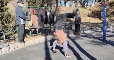 北京公园里,美女健身教练要在单杠上挑战七旬大爷