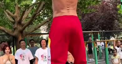 北京公园里,美女健身教练要在单杠上挑战七旬大爷